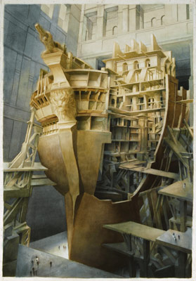 look into its bilge, admire the hyper-realistic structure, accurate in every detail, we see a whole town, a metropolis, a town ship, which is built in the nave, a place of refuge and consolation, and then once completed is slowly being raised and finally being launched. But the ship doesn't go on a voyage of discovery; together with the assembled human community sharing a common destiny on board it is trying to escape the threatening doom: the Ark is a survival room, a rescue vehicle. Later again we find these Arks stranded, wedged between rocks, partly mutated into wrecks, disembowled skeletons. Humans can hardly be seen in these paintings. The water has withdrawn. The Flood is over.