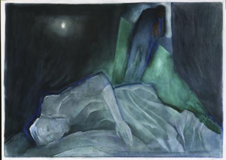 In a third cycle Willi Facen varies the same theme on an individual level one more time: these drawings, sketches and watercolours show stress situations – at work, in the open – they show worn-out women's bodies, rumpled beds, the wretched memory of a nightmare. We feel the build-up of aggression which Facen has ascribed to these pictures in which he depicts the emotionally charged, drugged protagonists of our age as soulless mechanical men: Noah's grandsons.
